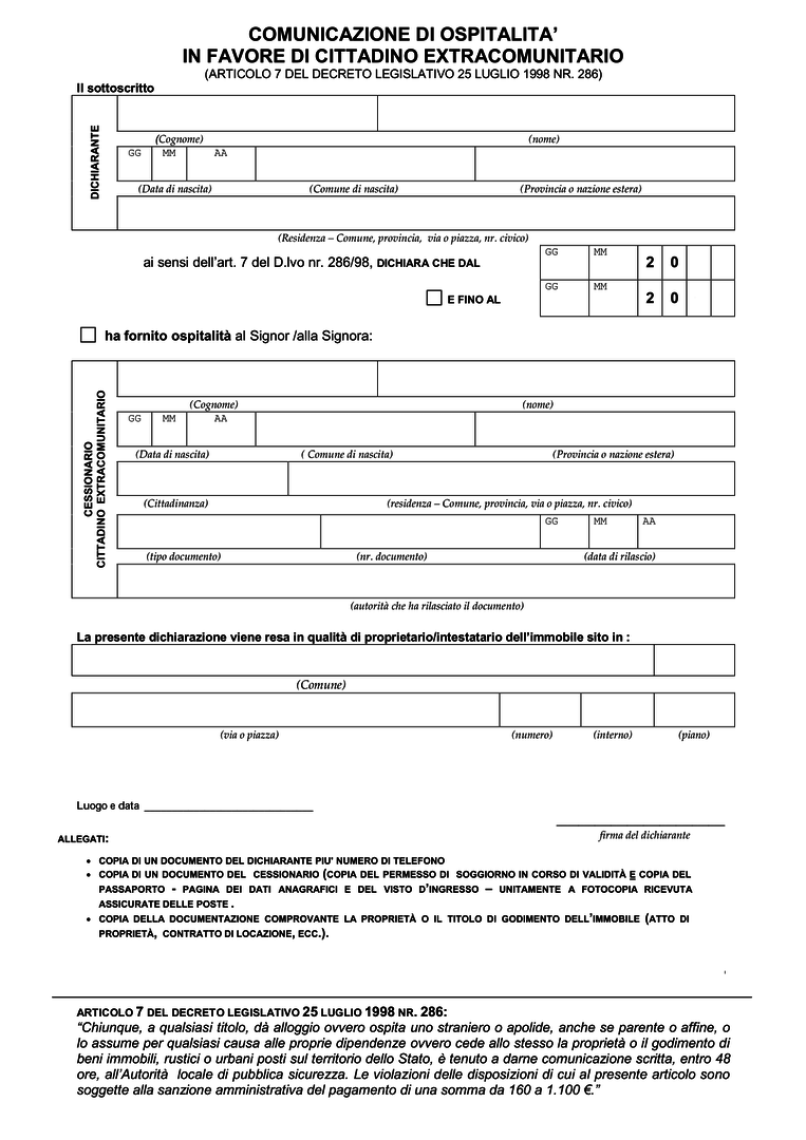 1. Chiunque, a qualsiasi titolo, da alloggio ovvero ospita uno straniero o apolide, anche se parente o affine, ovvero cede allo stesso la proprietà o il godimento di beni immobili, rustici o urbani, posti nel territorio dello Stato, è tenuto a darne comunicazione scritta, entro quarantotto ore, all'autorità locale di pubblica sicurezza.
